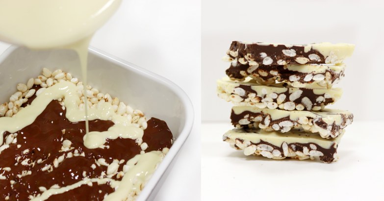Versare in una pirofila o contenitore in ceramica o vetro il riso soffiato e distenderlo affinchè ricopra l’intera superficie del contenitore (arrivare ad uno spessore di 1 cm). Far sciogliere il cioccolato (a bagno maria oppure nel microonde) e versarlo sopra avendo cura di andare a coprire tutto il riso. A piacere, utilizzare differenti tipi di cioccolato tra fondente, bianco e al latte per un effetto variegato.