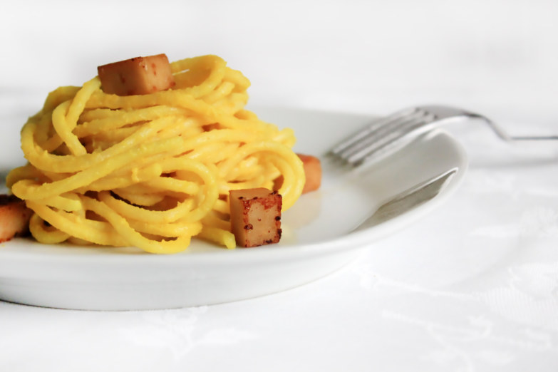 Aggiungi nella stessa padella la pasta al dente, con un mestolo di acqua di cottura della pasta e finisci la cottura. Solo all’ultimo aggiungi il tofu (o tempeh, o seitan) e regola di pepe se ti piace.
