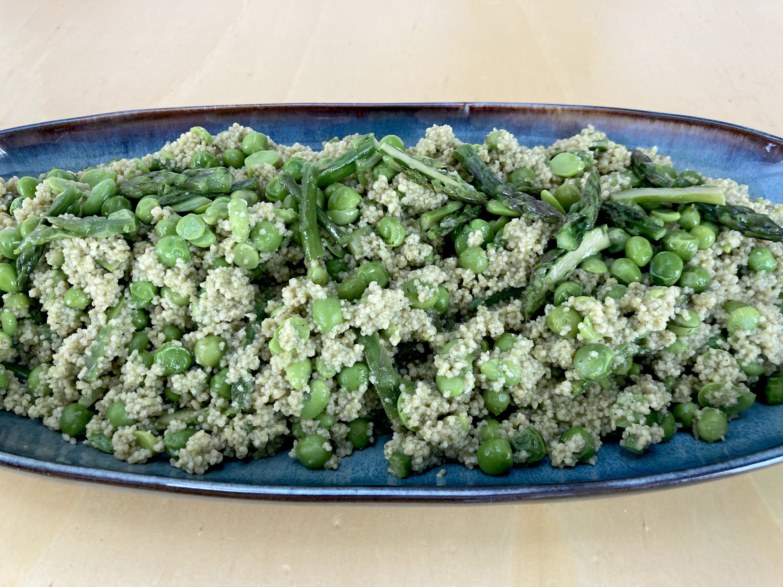 Riportare a bollore l’acqua di cottura degli asparagi, e in una ciotola versare la stessa quantità di cous cous (250 g) e di acqua di cottura (250 ml), aggiungere un filo d’olio, coprire e lasciare assorbire completamente (circa 10 minuti).