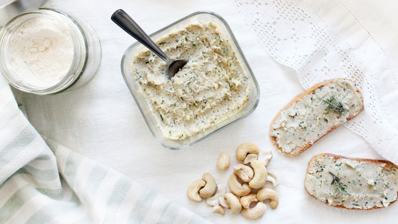 Frulla gli anacardi con acqua, succo di limone, lievito e sale fino a ottenere una crema liscia.