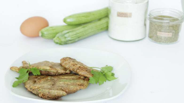 Lava le zucchine e tagliale e pezzettini piccoli e sottili. In una scodella metti la farina, l’uovo, il mezzo bicchiere d’acqua e la punta di un cucchiaino di lievito per dolci. Mescola bene, aggiungi le zucchine e il cucchiaio di mix per tzatziki, continua a mescolare finchè gli ingredienti non risulteranno ben legati.