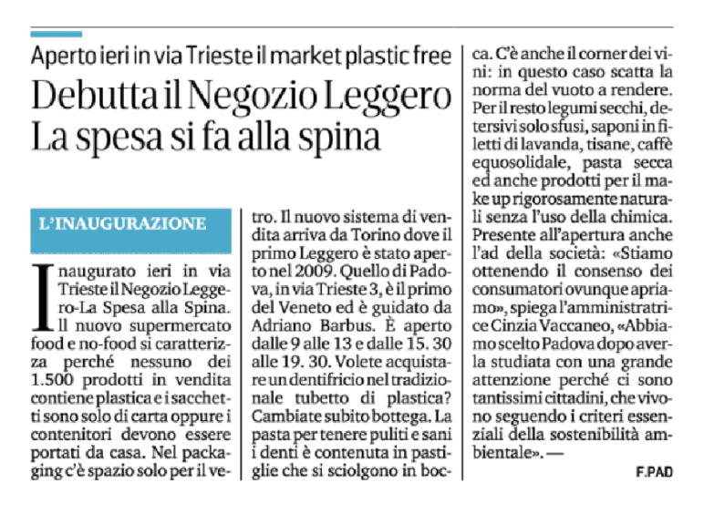Il mattino | Press Aperto ieri in via Trieste il market Plastic free. Debutta il Negozio Leggero. La spesa si fa alla spina.