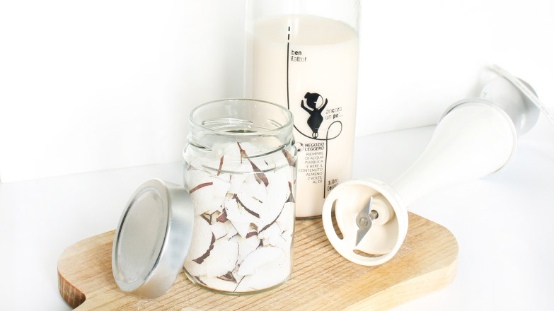 Scaldare il litro di acqua e portarlo alla temperatura di 80°. Aggiungere il cocco a fette e il sale e lasciare in ammollo per una notte intera in frigorifero.