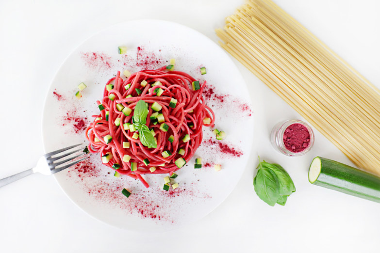 Una volta cotta la pasta trasferirla nella padella e aggiungere un cucchiaino di polvere di barbabietola. Per amalgamare meglio la polvere aggiungere un po’ di acqua di cottura della pasta. Le linguine diventeranno di un rosa acceso che donerà al piatto una marcia in più. Aggiungere i cubetti di zucchine e guarnire con qualche foglia di basilico.