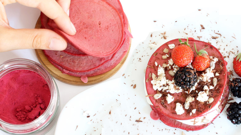Metti in una ciotola la farina, la polvere di barbabietola e il lievito (se vuoi puoi aggiungere lo zucchero, ma ti proponiamo di provare senza).