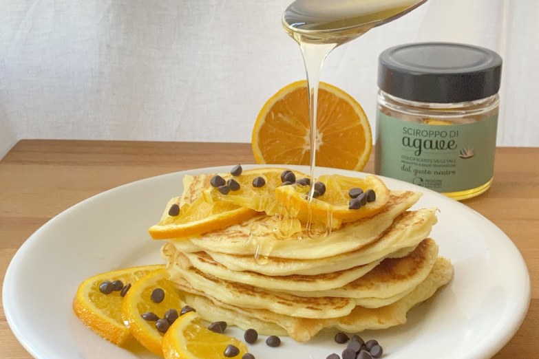 Tagliare un’arancia e ricavarne da una metà delle fettine, impanarle nello zucchero e una volta cotti i pancakes, far caramellare le fette di arancia zuccherate aggiungendo il succo dell’altra metà di arancia non tagliata.