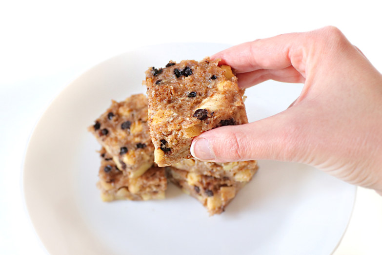 Tagliare il pane e la mela a cubetti (per una consistenza più uniforme grattugiarla) e metterli in un’insalatiera. Mescolare il latte, lo sciroppo d’agave e la cannella, poi unire il tutto al pane e alle mele. Lasciare in ammollo e lavorare con un cucchiaio fino a quando il pane si sarà completamente ammorbidito. Aggiungere l’uvetta o le gocce di cioccolato, versare in una teglia da 24cm unta e infornare a 180°C per 40-45 minuti.