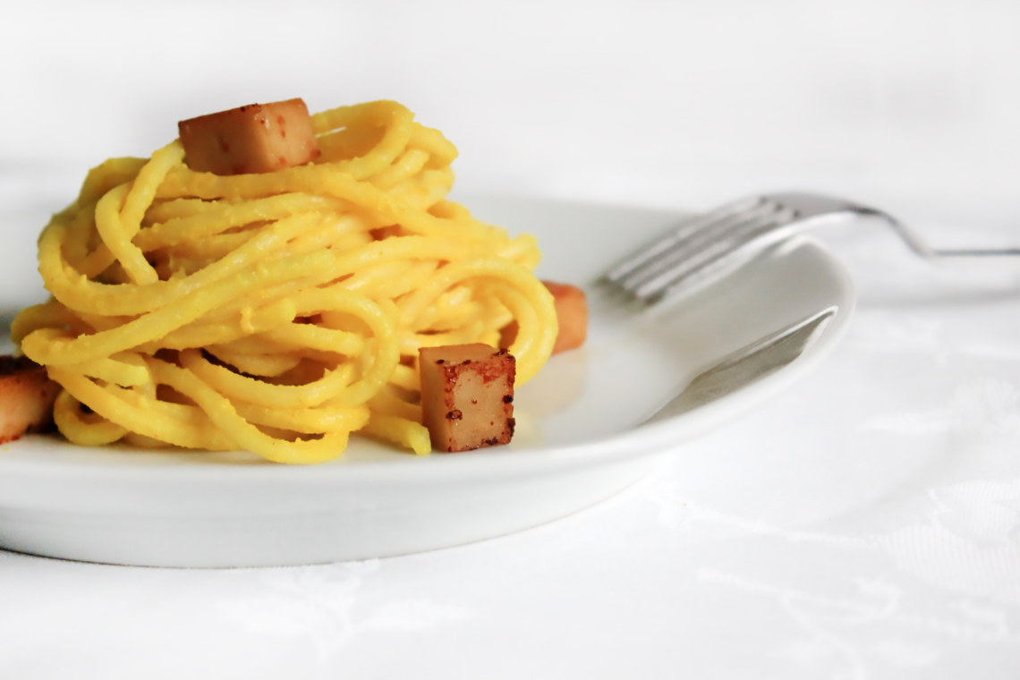 20 min Difficoltà facile Per 4 persone 320-400g spaghetti* o linguine* 100g seitan* un po' di salsa di soia* 1 bicchiere di latte vegetale* 1 cucchiaio di olio 1/2 cucchiaino di sale Kala Namak fino* 1 cucchiaio di lievito in fiocchi* 2 cucchiai di farina di ceci* A piacere: un pizzico di curcuma* o della paprika* e del pepe*. *prodotti disponibili presso Negozio LeggeroMetti a cuocere gli spaghetti in…