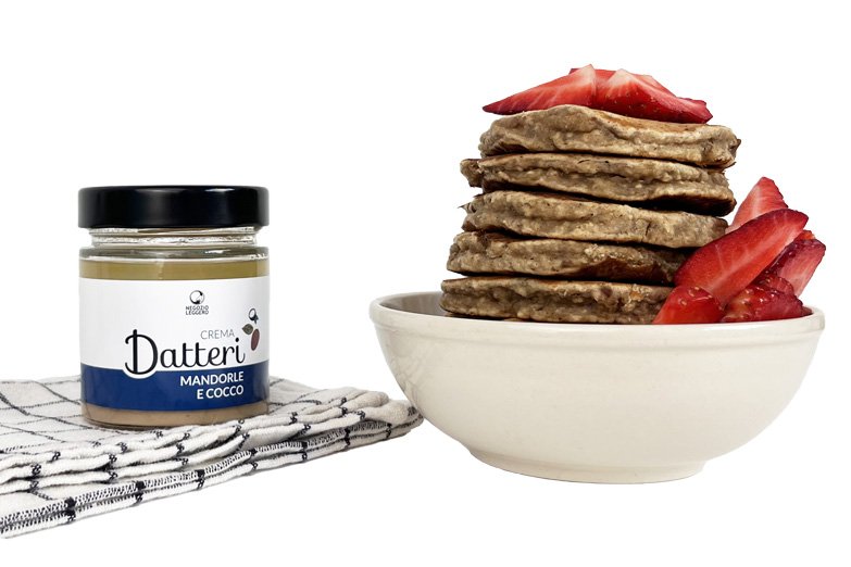 5 min di preparazione + tempo di cottura Difficoltà facile Per 16-20 pancake nel formato medio 50 g farina di mandorle* 100 g datteri* tagliati a cubetti 1 banana 1 cucchiaio di una crema di frutta secca* (noi suggeriamo quella di datteri*) 250 ml latte vaccino o latte vegetale* 150 g farina* 75 g fiocchi d’avena* 2 cucchiaini di lievito per dolci* Opzionale 1/2 cucchiaino di cannella…