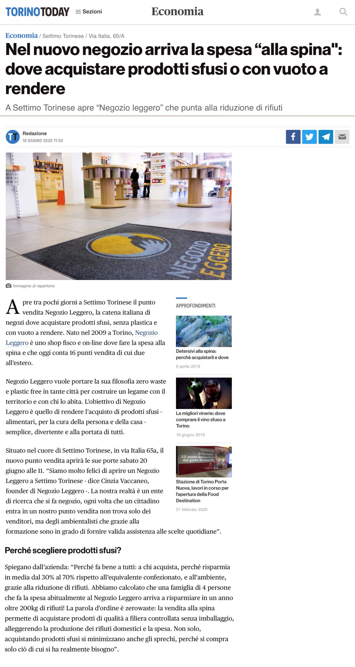 A Settimo Torinese apre "Negozio Leggero" che punta alla riduzione dei rifiuti